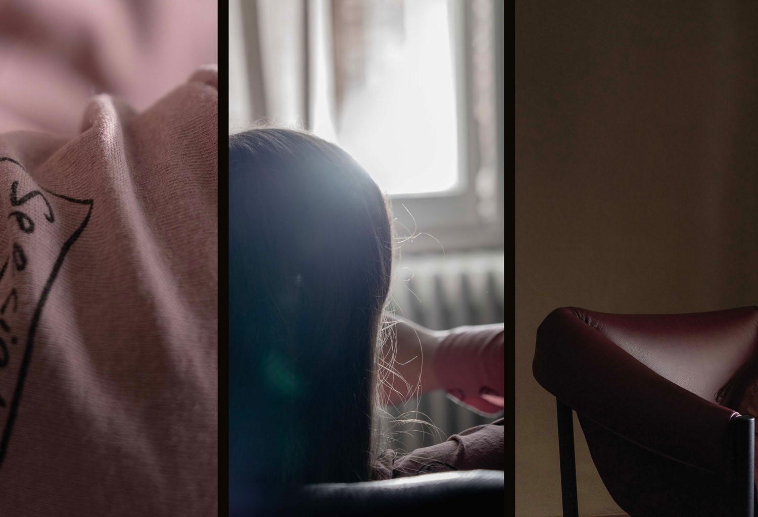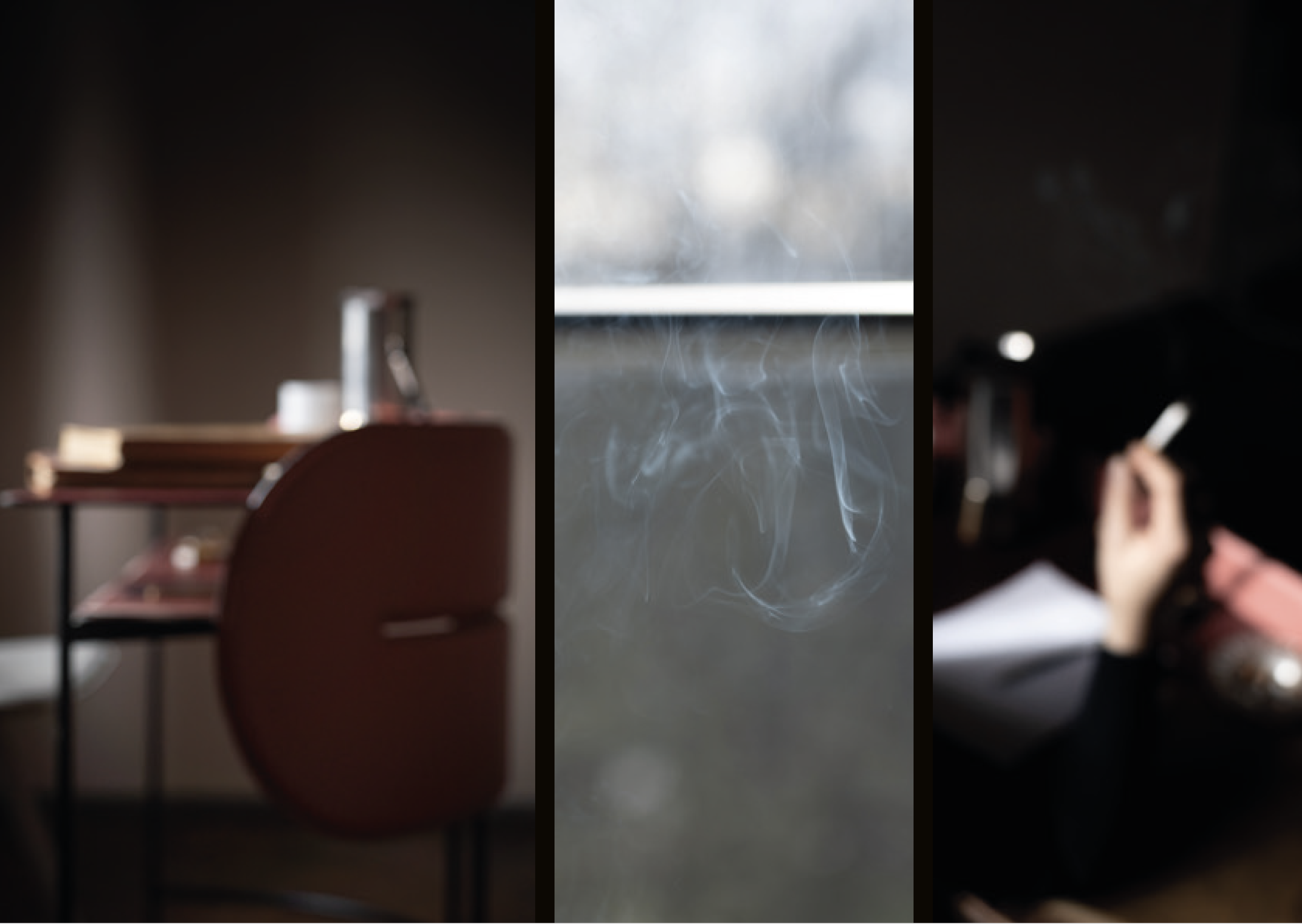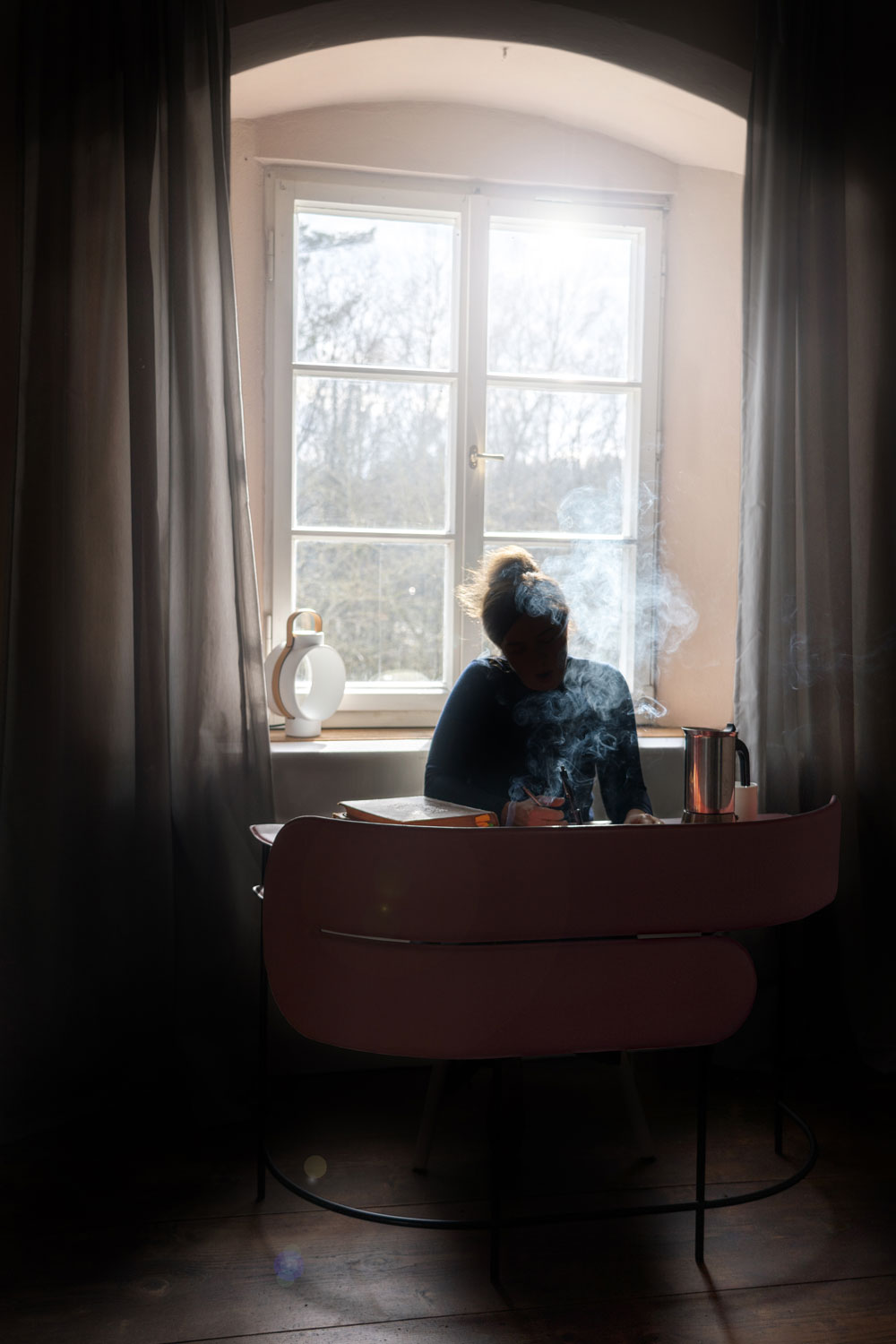 The sun is now high in the sky. Gemma (43) is still sitting at her SMALL DESK. She has a smoke.