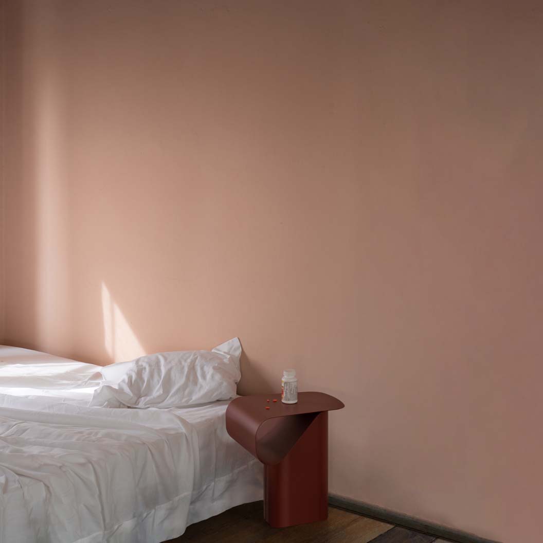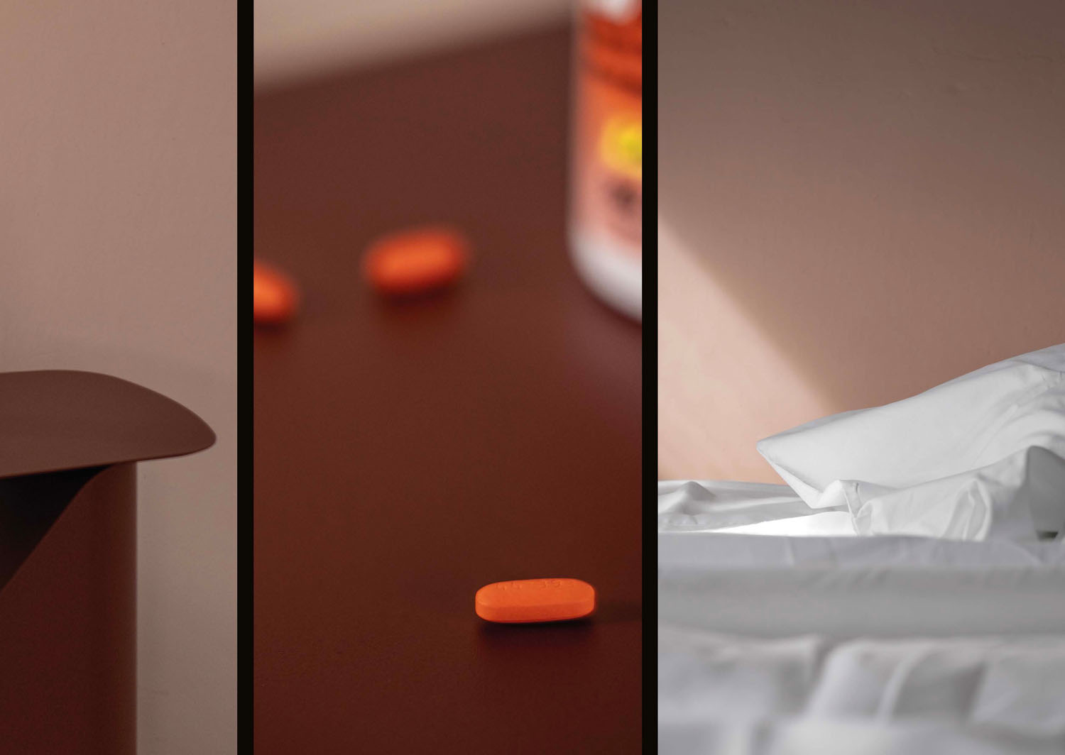 On the BEDSIDE TABLE, a tipped over bottle, some bright