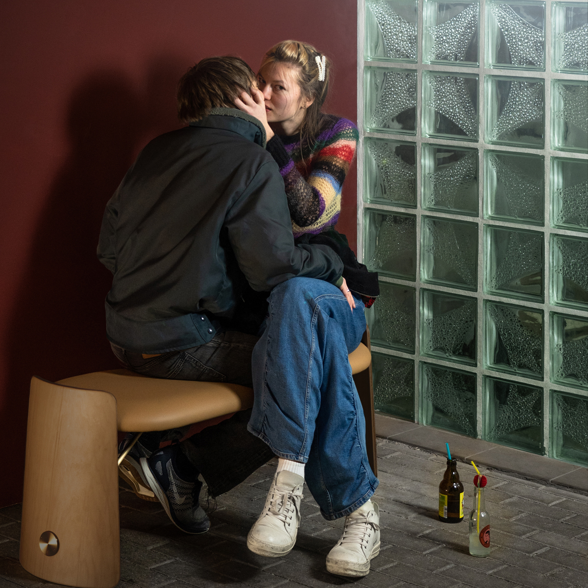 The elevator doors open, and Arnold steps out into the lobby. A young COUPLE is sitting astride of one of the BENCHES that line the lobby’s glass wall. Their half empty drinks are on the floor and they are kissing wetly, oblivious to the bustling that surrounds them. But as we pass them, the GIRL suddenly turns her head and looks STRAIGHT AT THE CAMERA.
