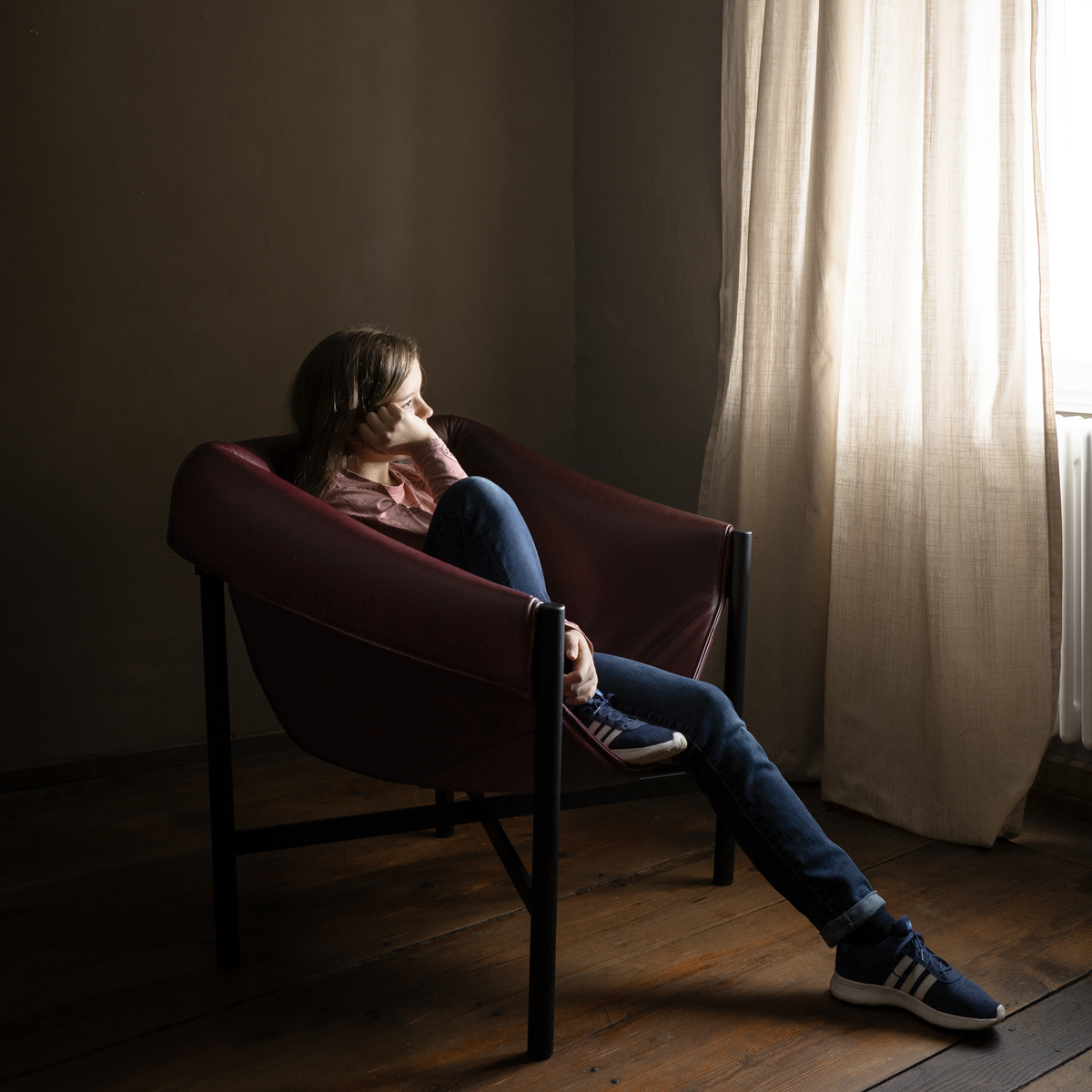 LOU (12) sits in a CHAIR by the window. A light breeze lifts the curtain. She has one leg pulled in, chin resting contemplatively in the palm of her hand. She does not see us.