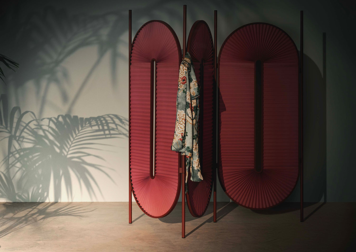 It is eerily quiet inside the pool house. We hear only the soft gurgling noise of the water lapping into the filter and the faint hum of the filter’s motor. A silk kimono withfloral print has been thrown carelessly over a PARAVENT. Suddenly, there a footsteps approaching fast on the gravel outside. A voice is calling loudly.