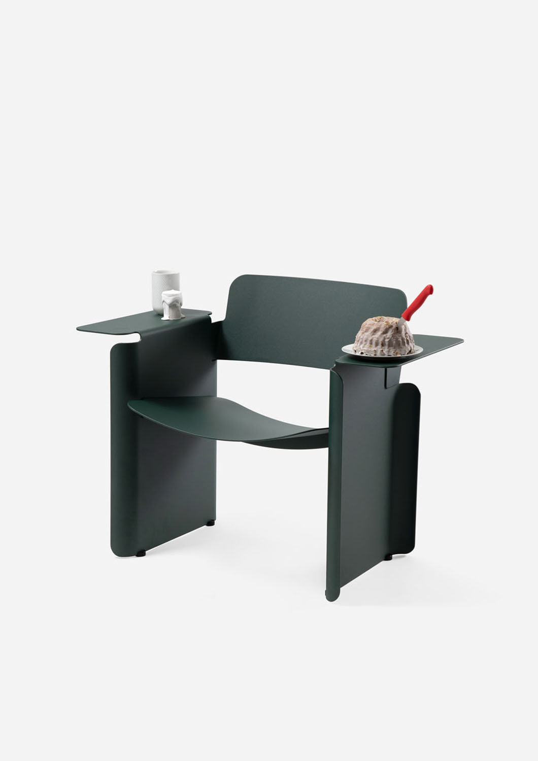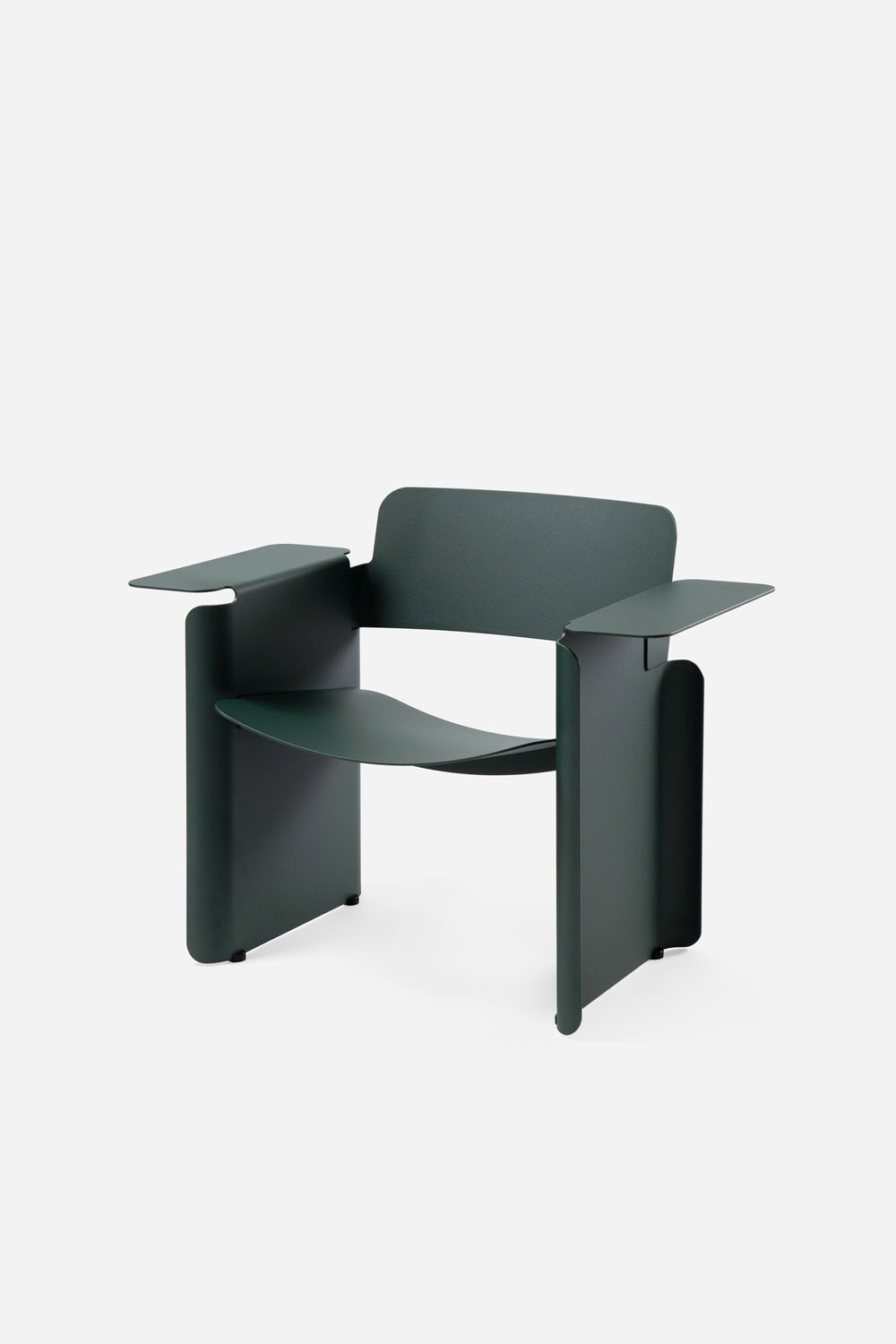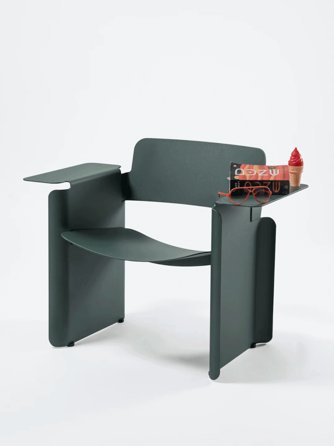 AL13 is a lounge chair made from laser-cut and bent aluminum sheets. Suitable for both indoor and outdoor use, it seamlessly fits into various spatial environments without compromising its unique typology. The prominent armrest offers flexible functionality, serving as a side table or temporary workspace to meet modern needs. Made entirely of aluminum, the chair’s individual components can be replaced in case of damage, promoting sustainable production.