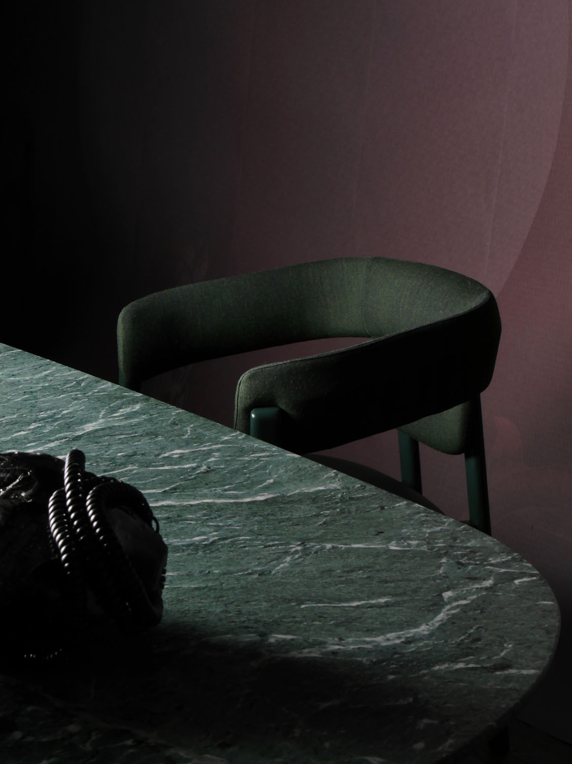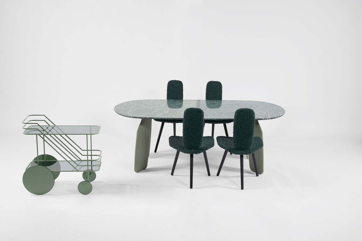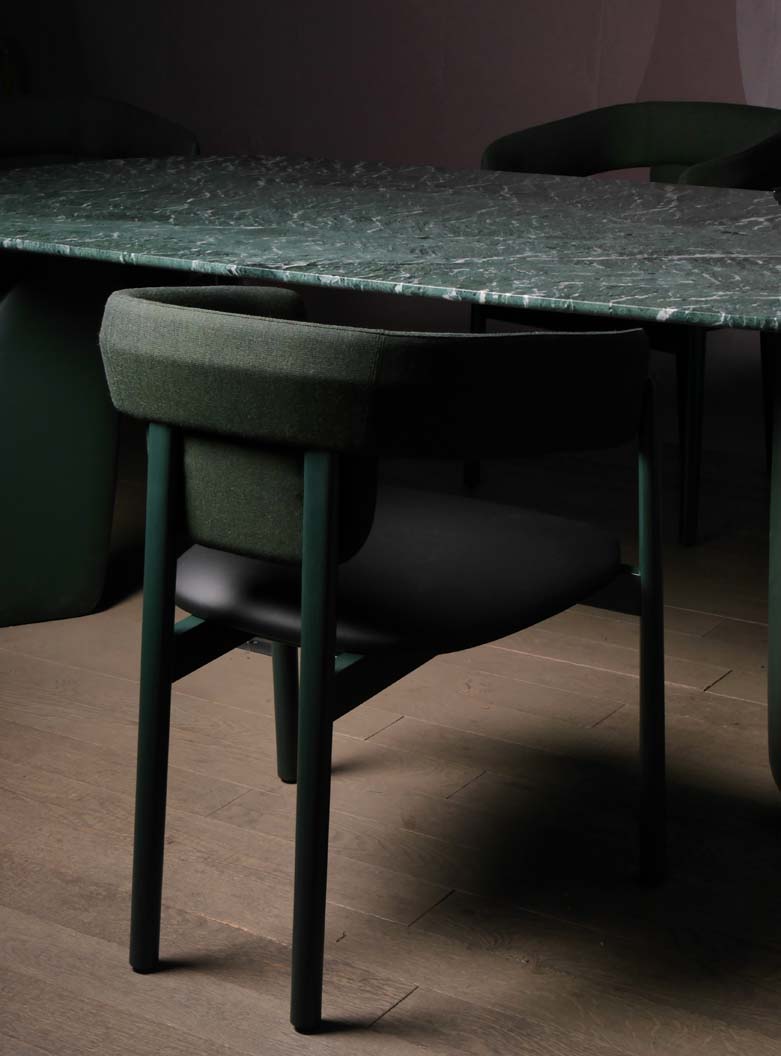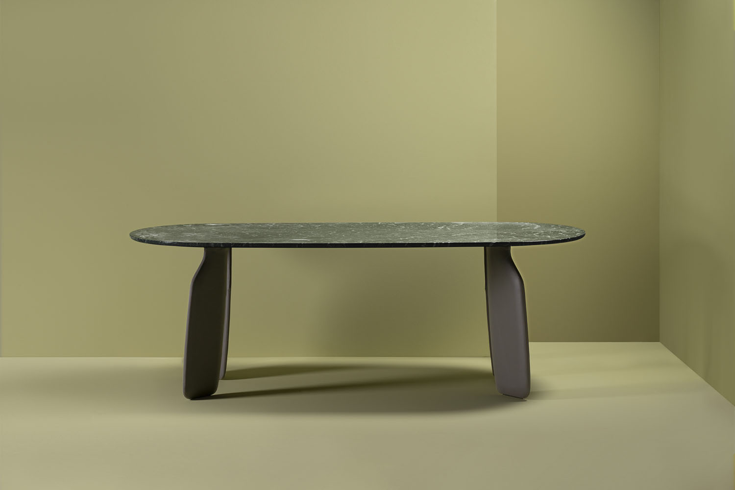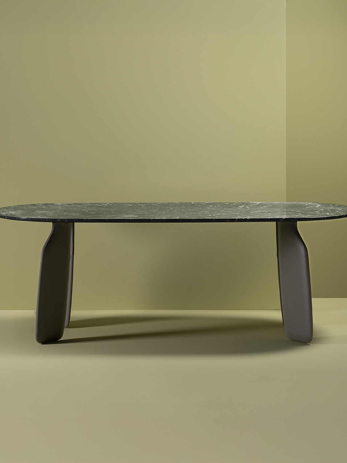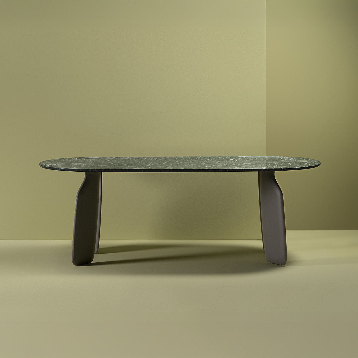 Bavaresk Oval is a dining table with a glass or marble top. The helm-shaped legs are milled out of multiply wood, and then lacquered or dressed in fabric or leather.