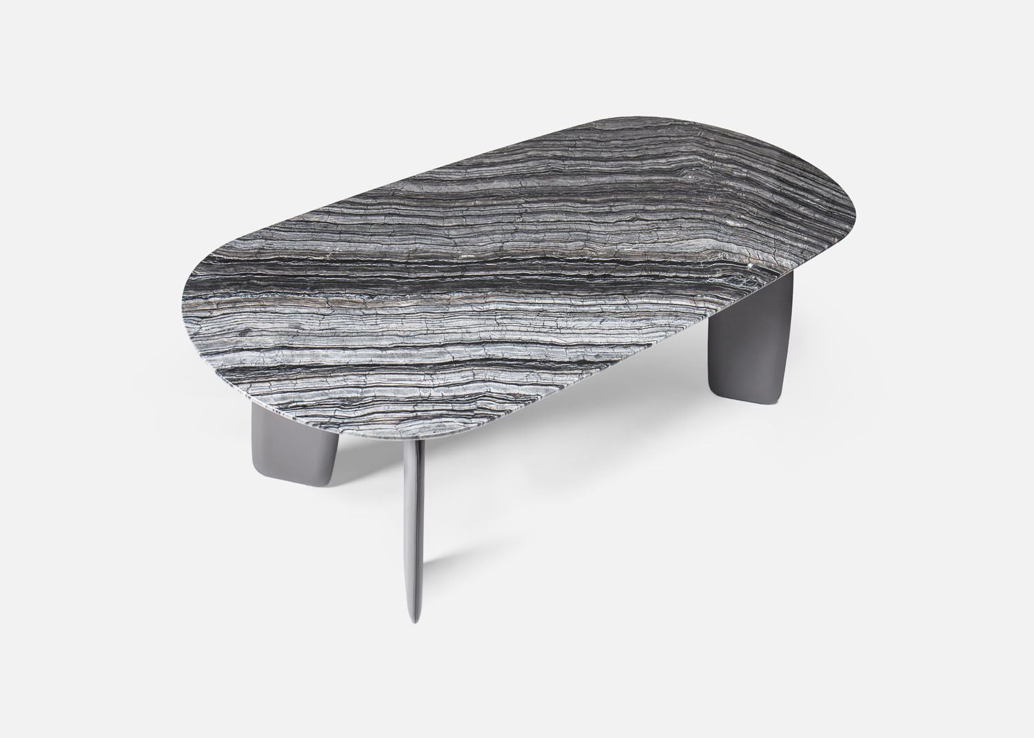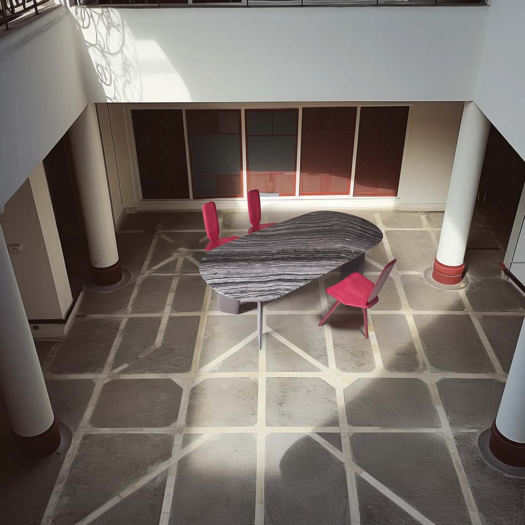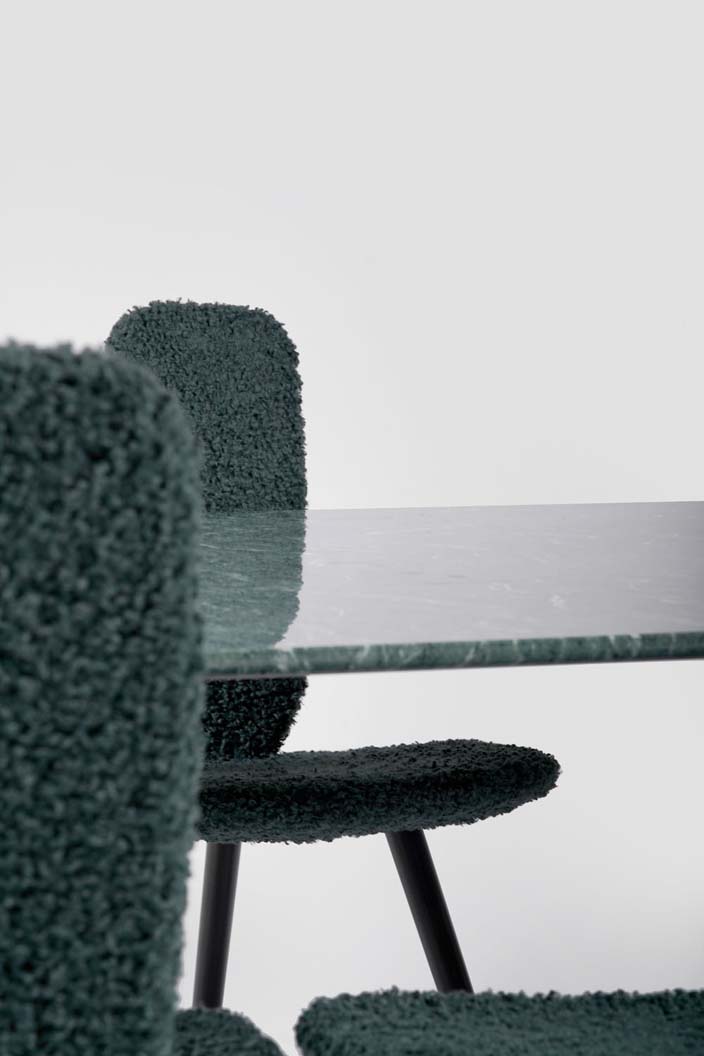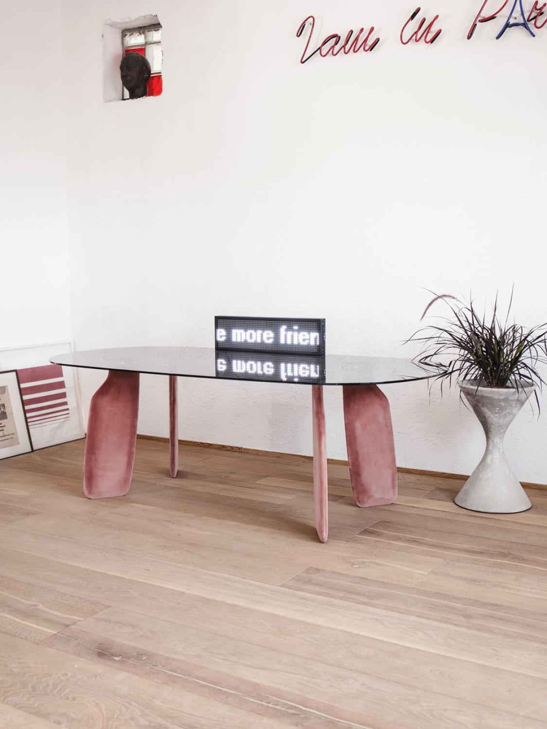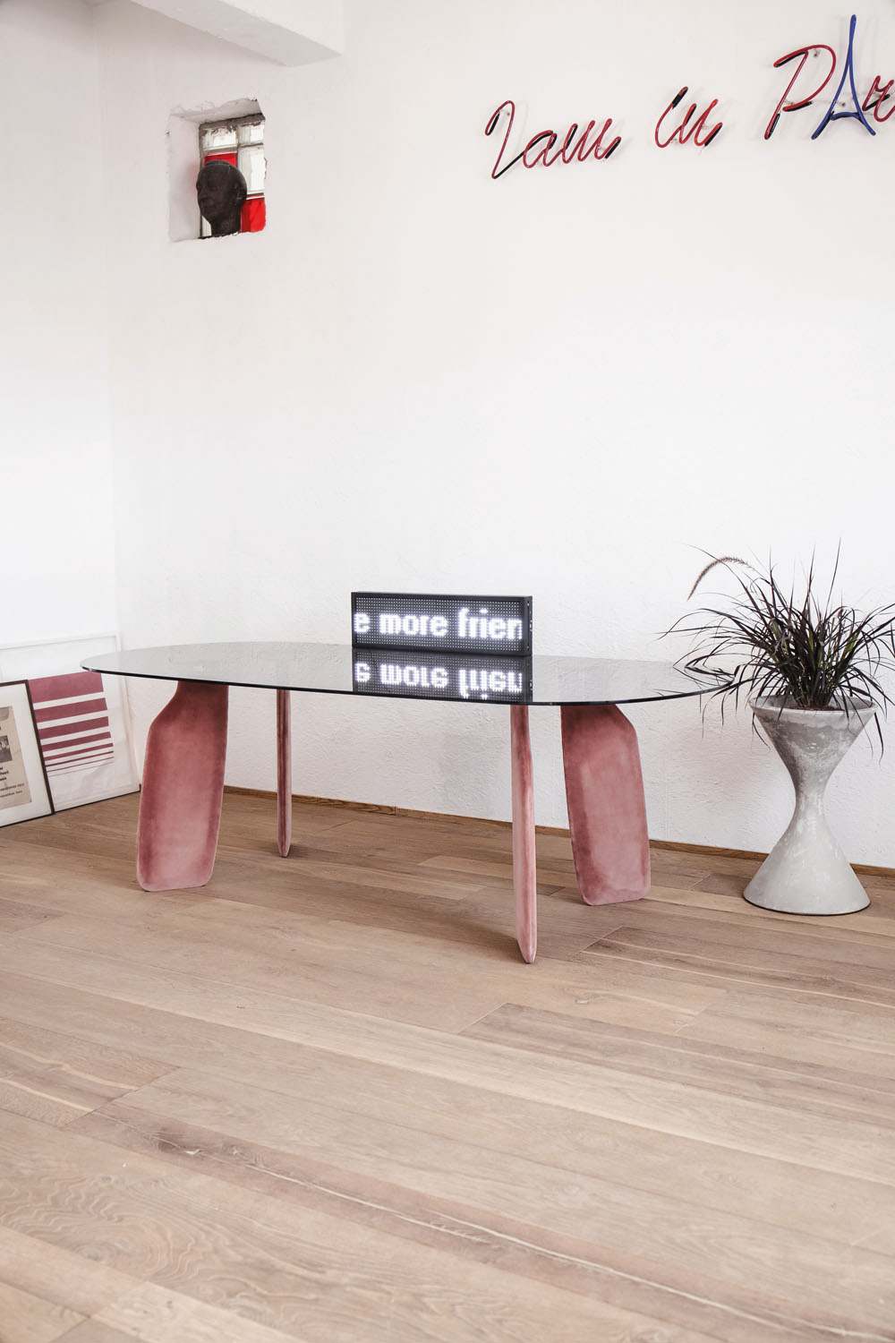 Bavaresk Oval is a dining table with a glass or marble top. The helm-shaped legs are milled out of multiply wood, and then lacquered or dressed in fabric or leather.