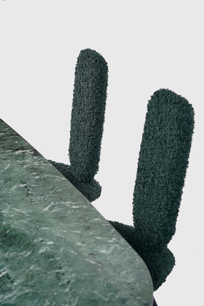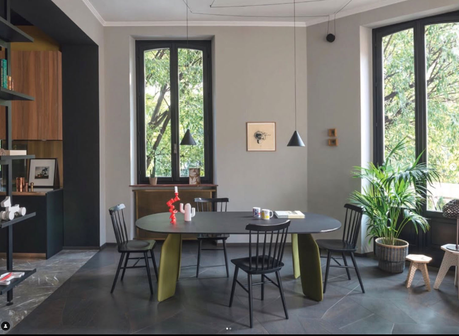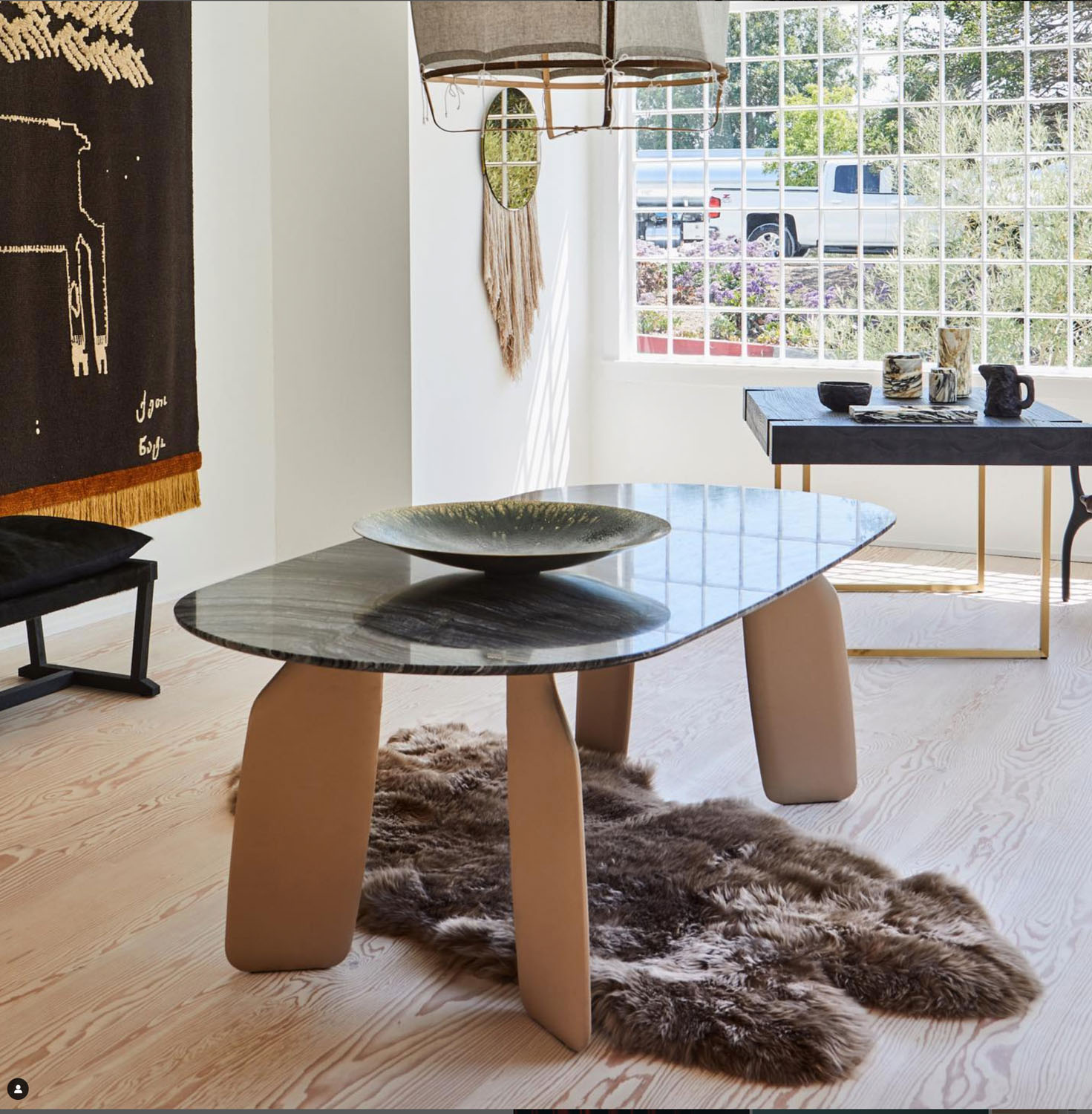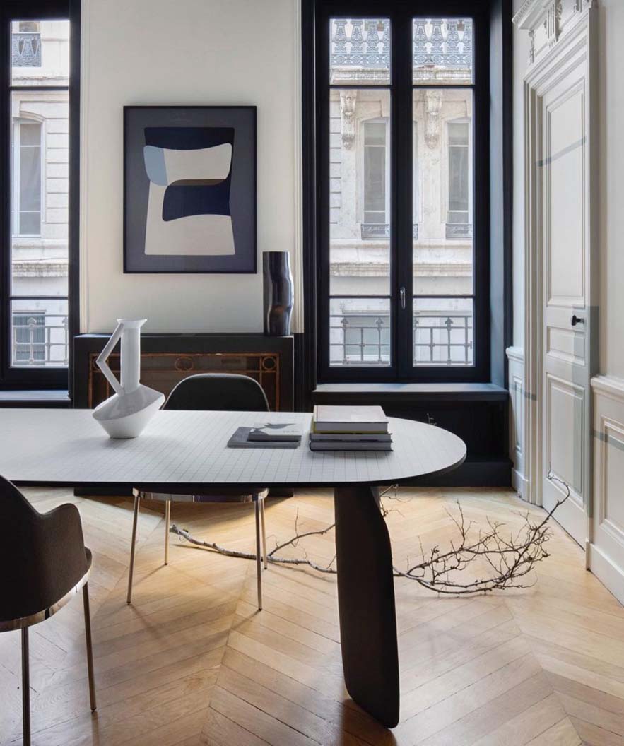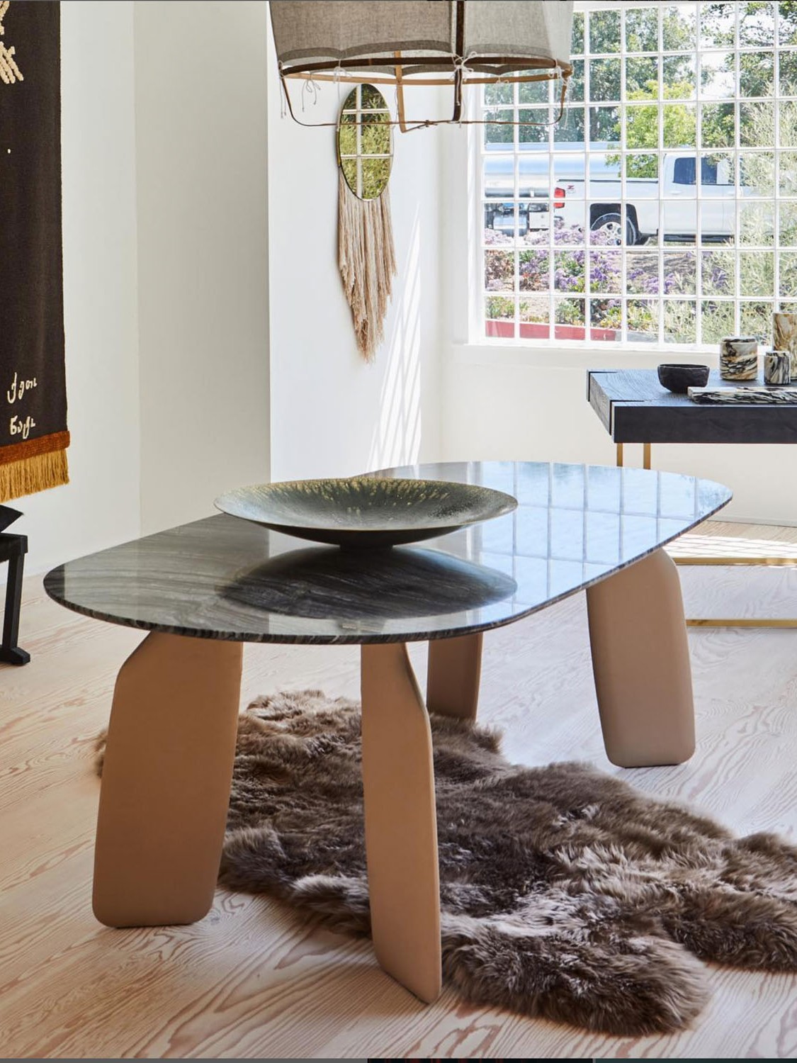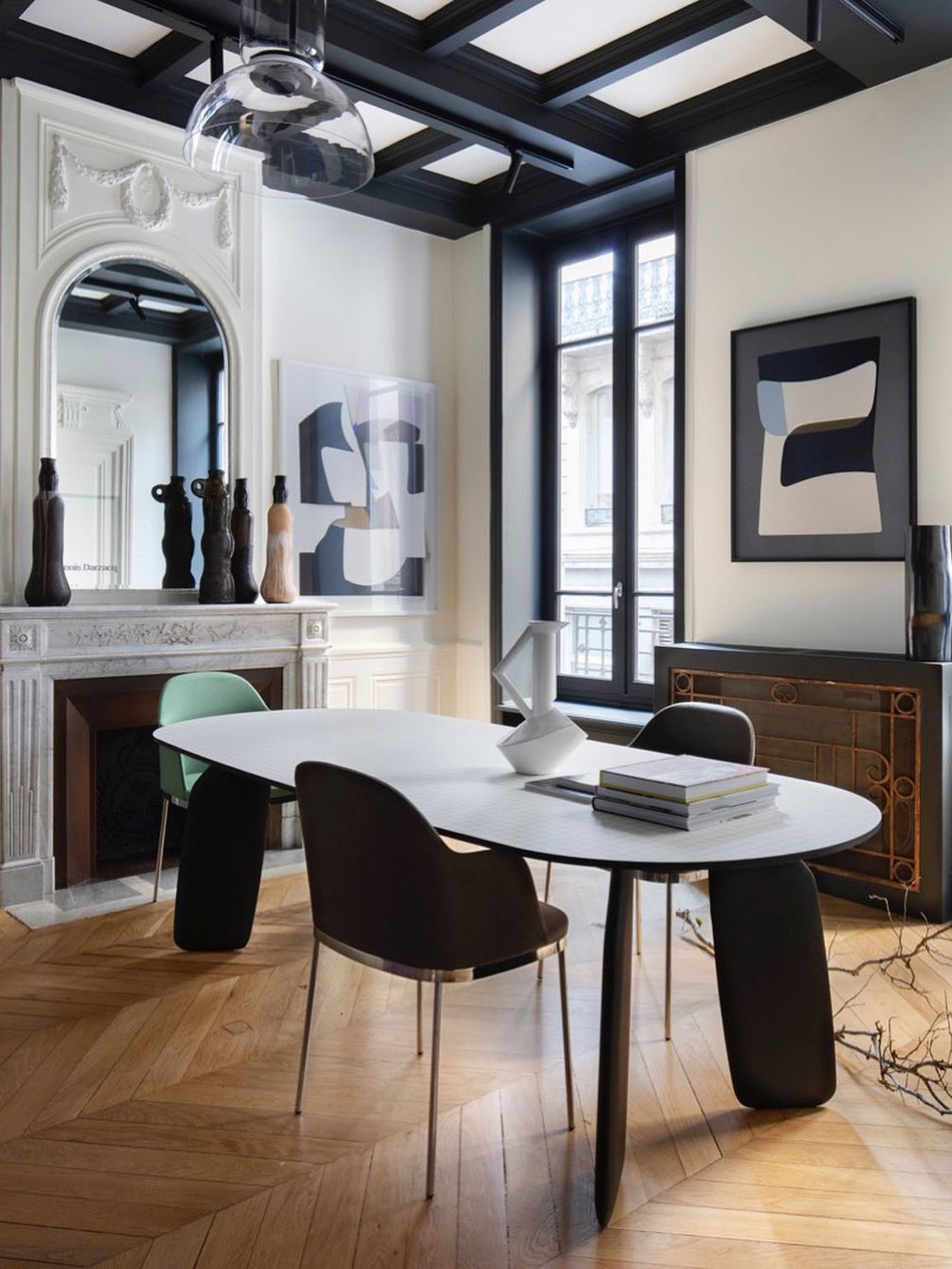 Bavaresk Oval is a dining table with a glass or marble top. The helm-shaped legs are milled out of multiply wood, and then lacquered or dressed in fabric or leather.