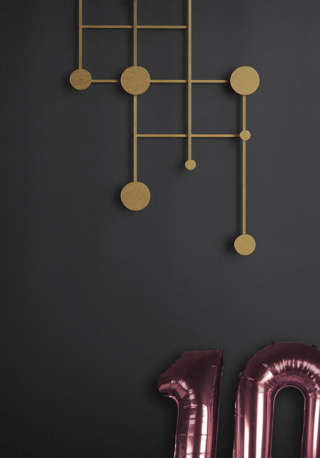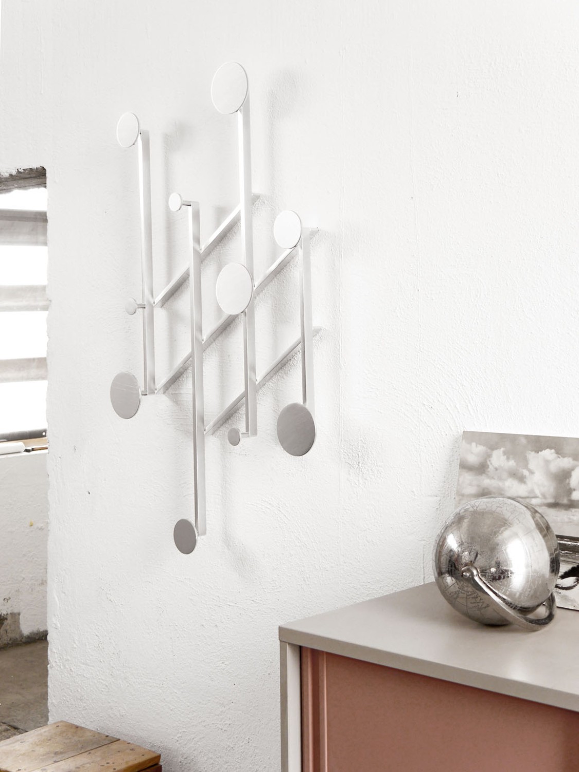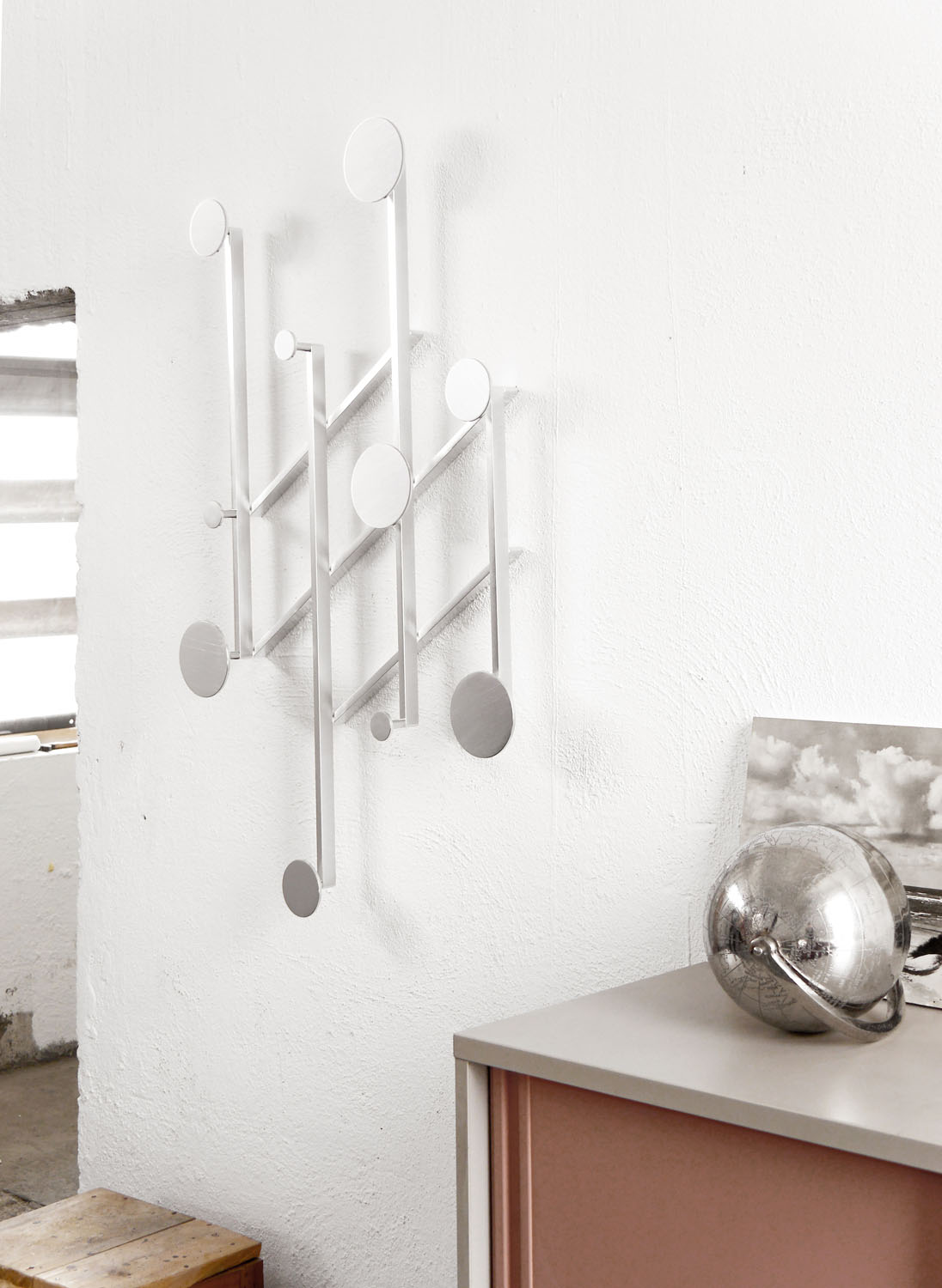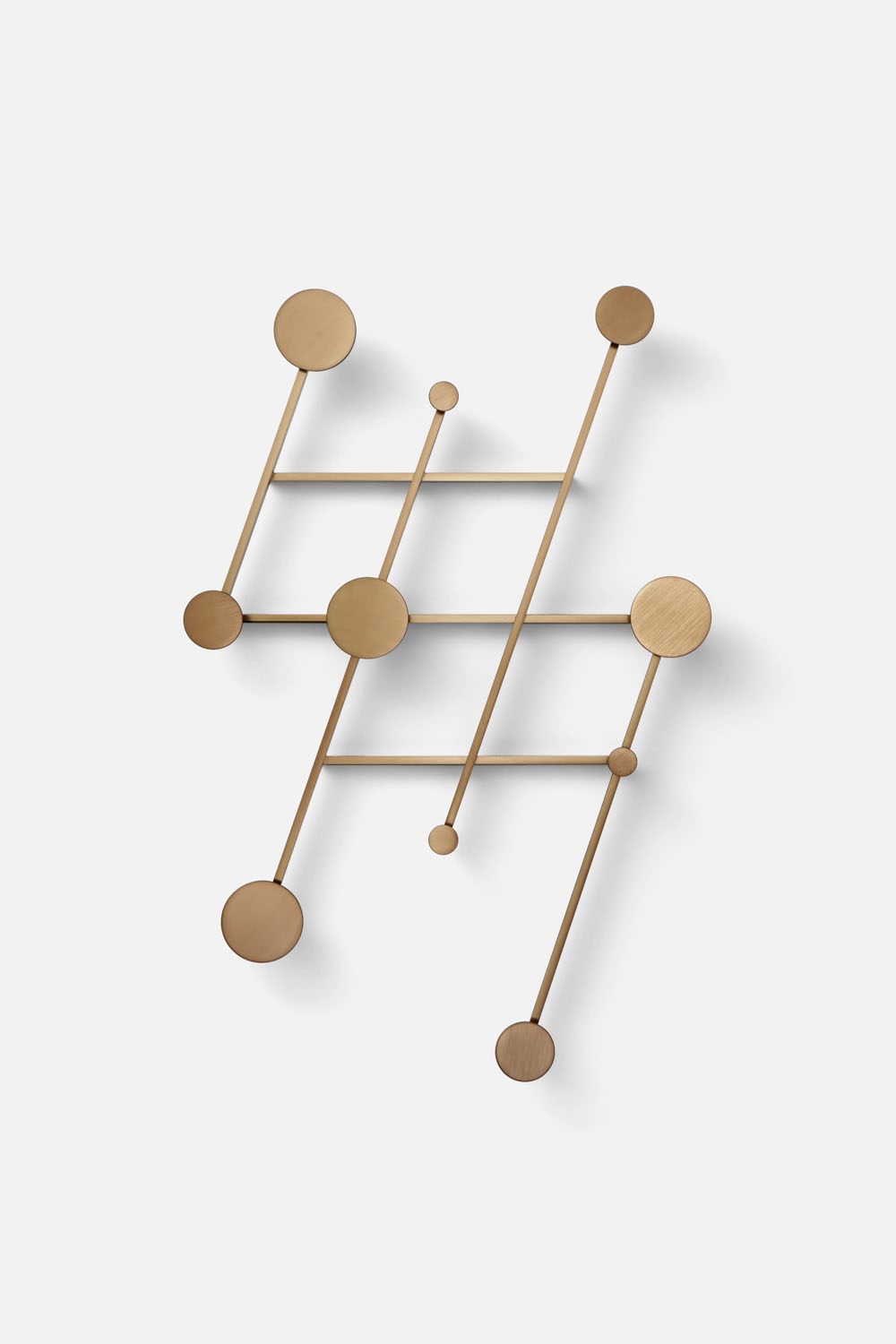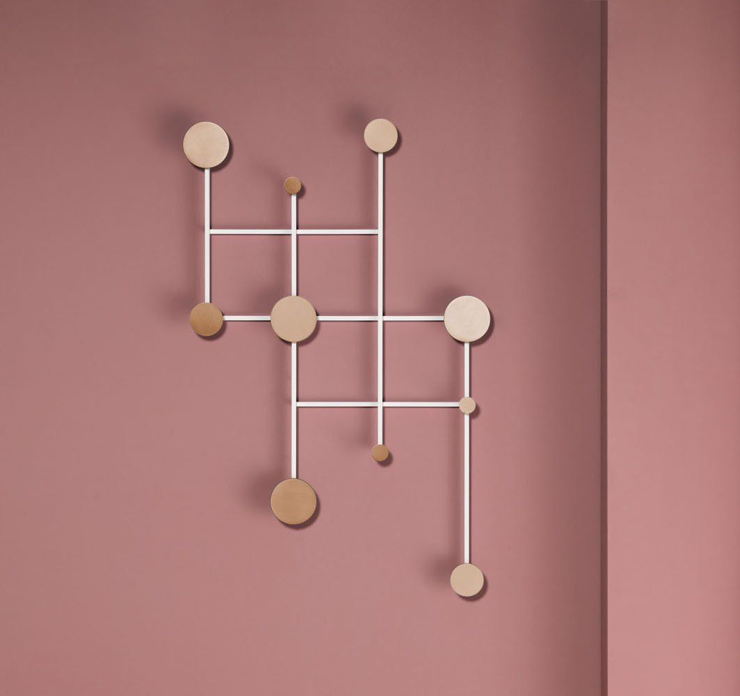 An adjustable aluminum coat rack inspired by the classic accordion-style design. Its strong geometric shapes and black and bronze color palette create a wall piece that is both decorative and functional. The asymmetrical design adds a playful touch.