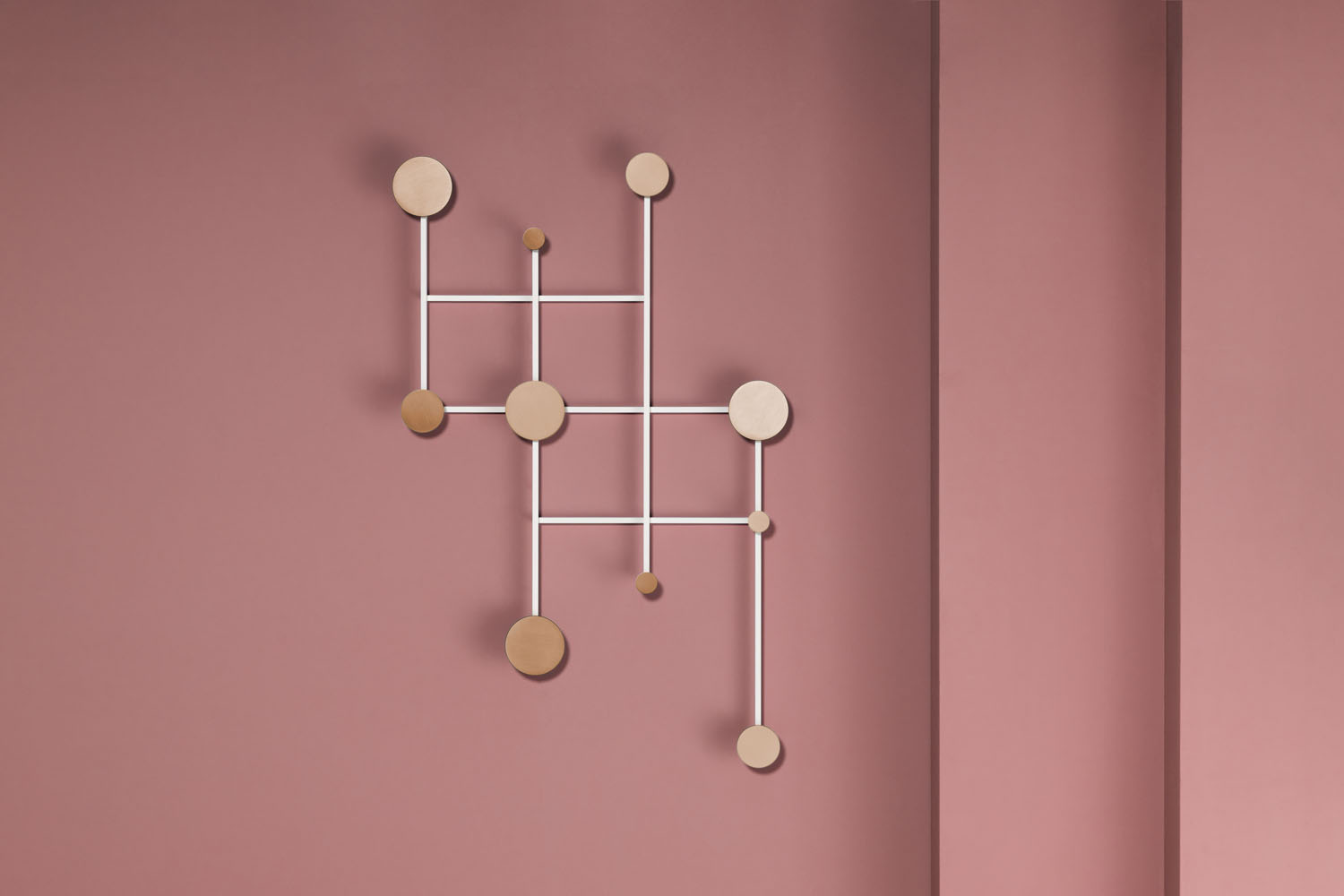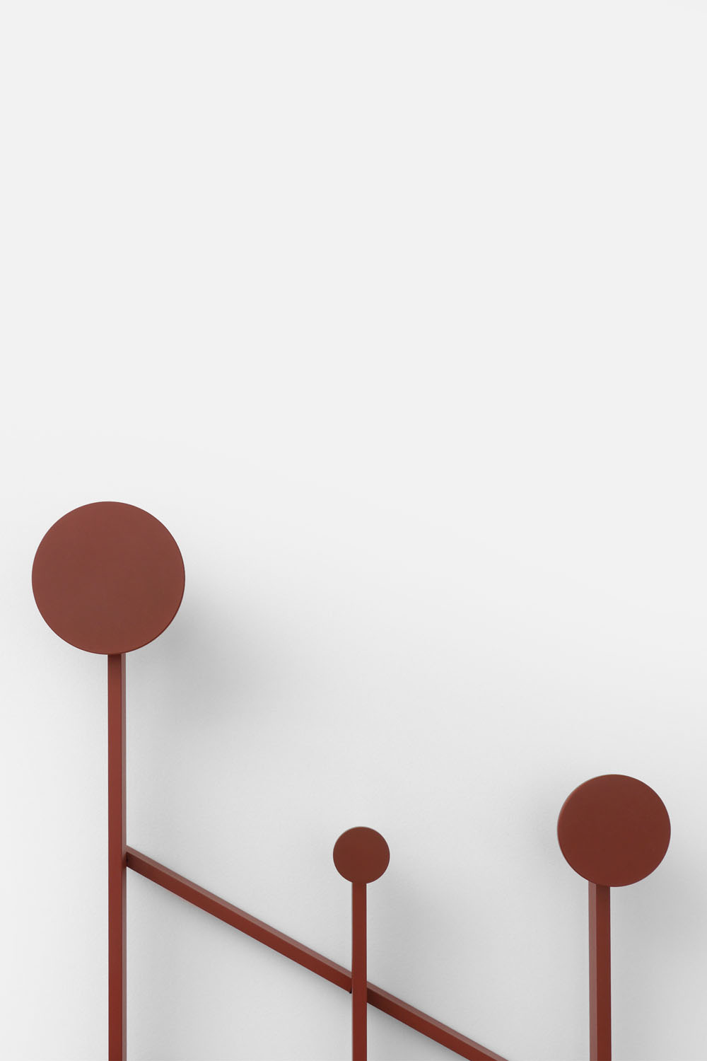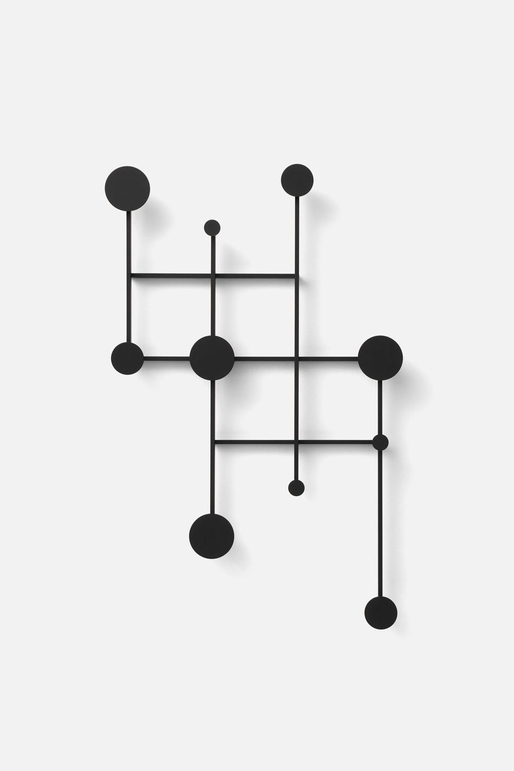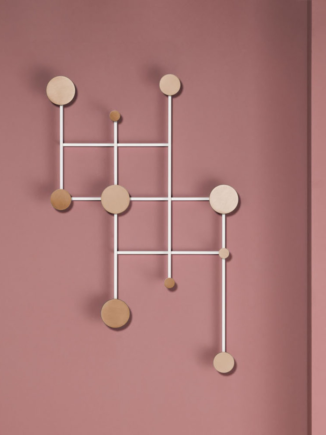 An adjustable aluminum coat rack inspired by the classic accordion-style design. Its strong geometric shapes and black and bronze color palette create a wall piece that is both decorative and functional. The asymmetrical design adds a playful touch.