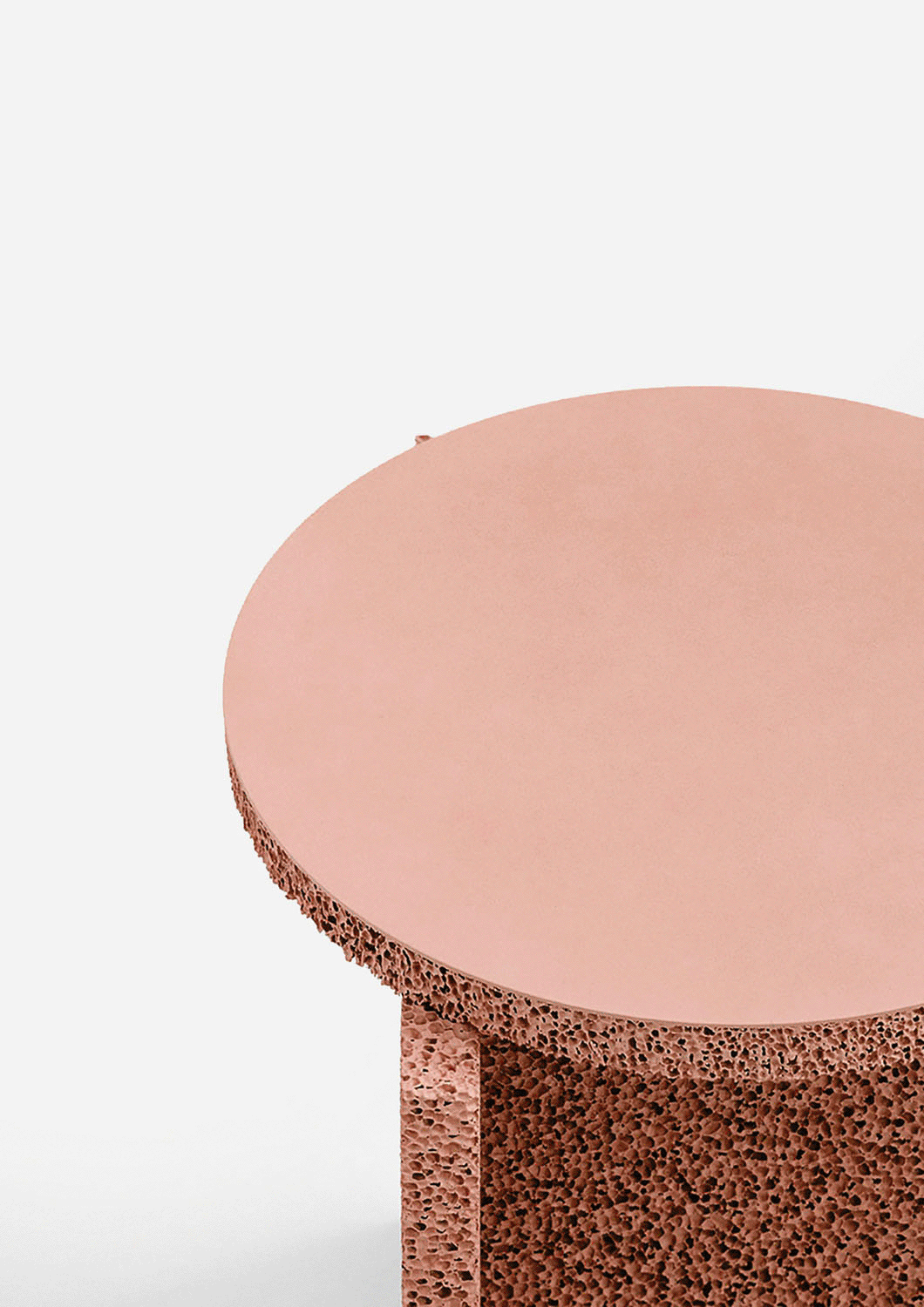 Made from carbonated aluminum panels - a common building material - the surface, once painted, becomes completely unrecognisable as metal. The Sponge table’s simple construction is designed to highlight the material’s use, accentuating its alchemic quality of transforming a standard building material into a luxury good.