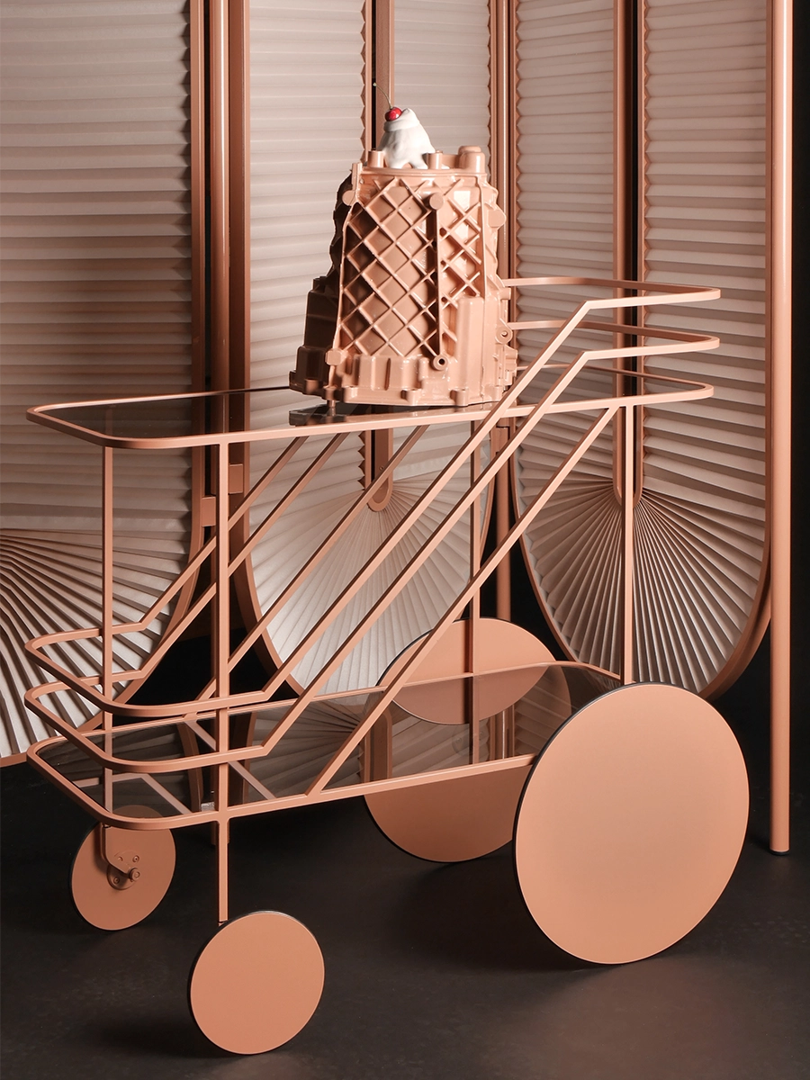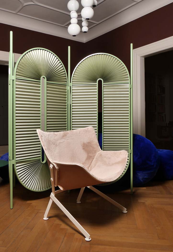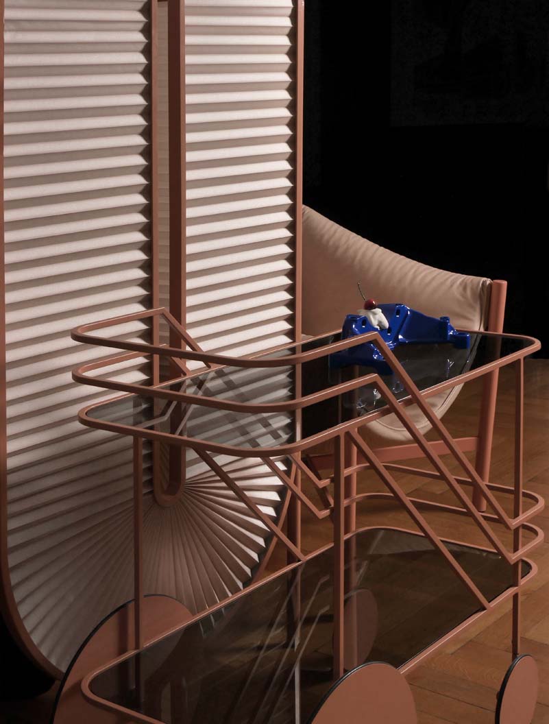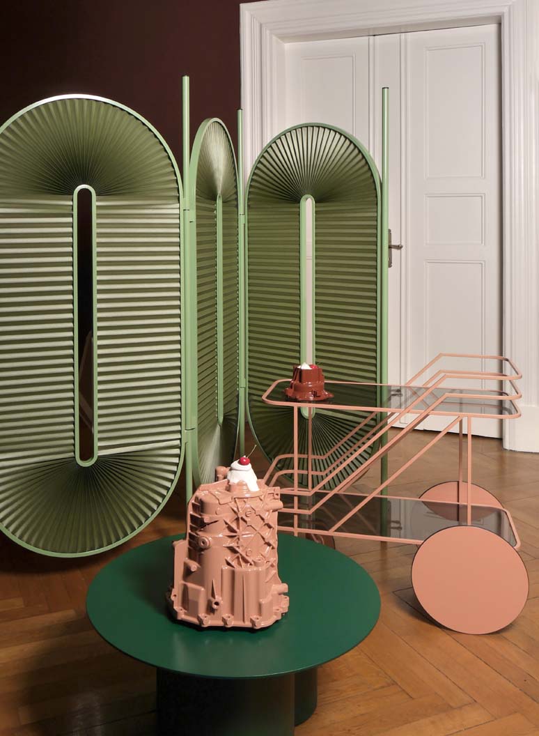 The brand’s signature Minima Moralia room divider and Come As You Are bar cart were revamped in glossy off the menu flavors, rosé and salvia. The matching A Cherry on Top sculptures by Aylin Langreuter complete the exhibition exploring the dialogue between Art and Design. Illuminated by Formagenda.