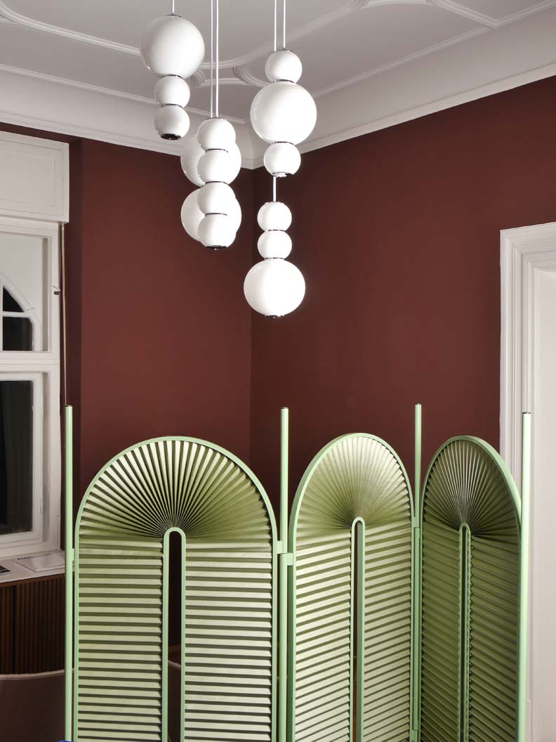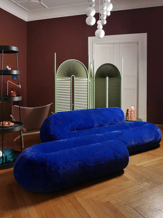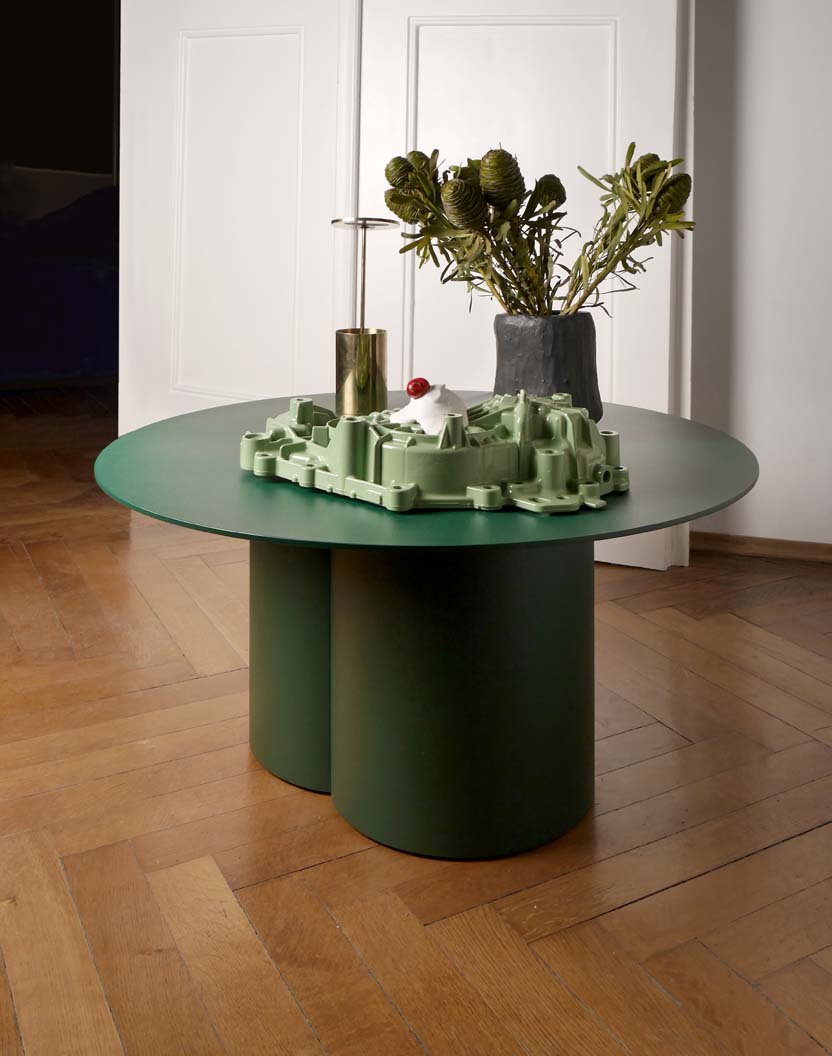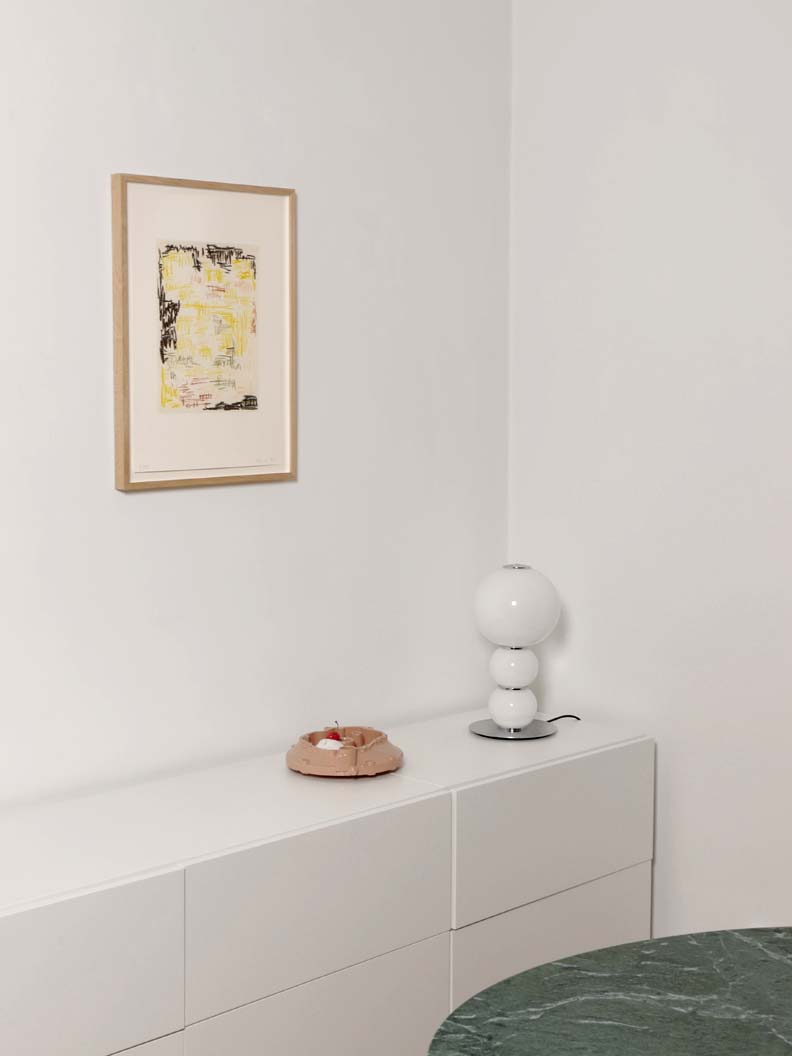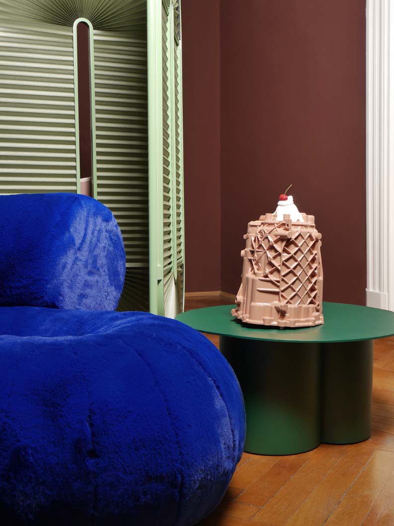The brand’s signature Minima Moralia room divider and Come As You Are bar cart were revamped in glossy off the menu flavors, rosé and salvia. The matching A Cherry on Top sculptures by Aylin Langreuter complete the exhibition exploring the dialogue between Art and Design. Illuminated by Formagenda.
